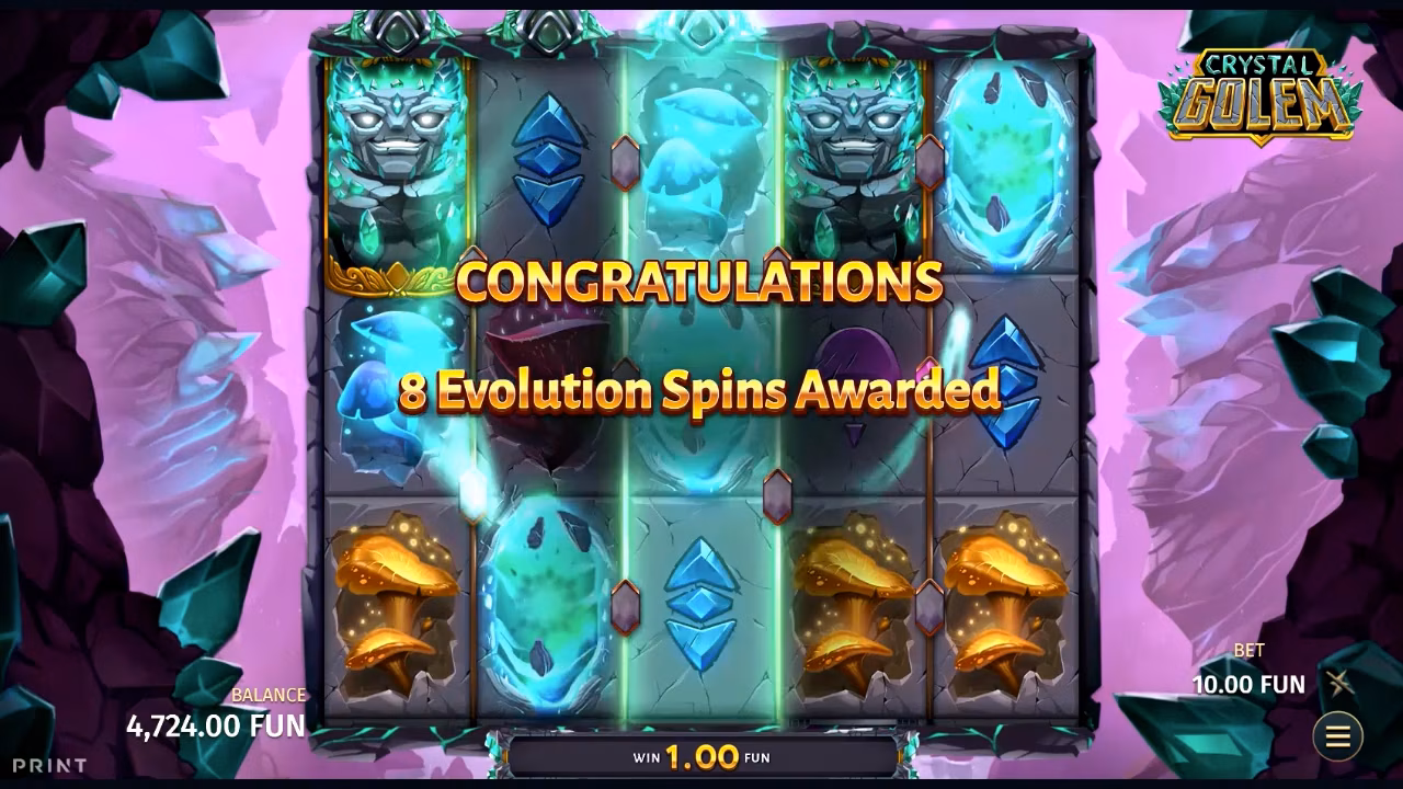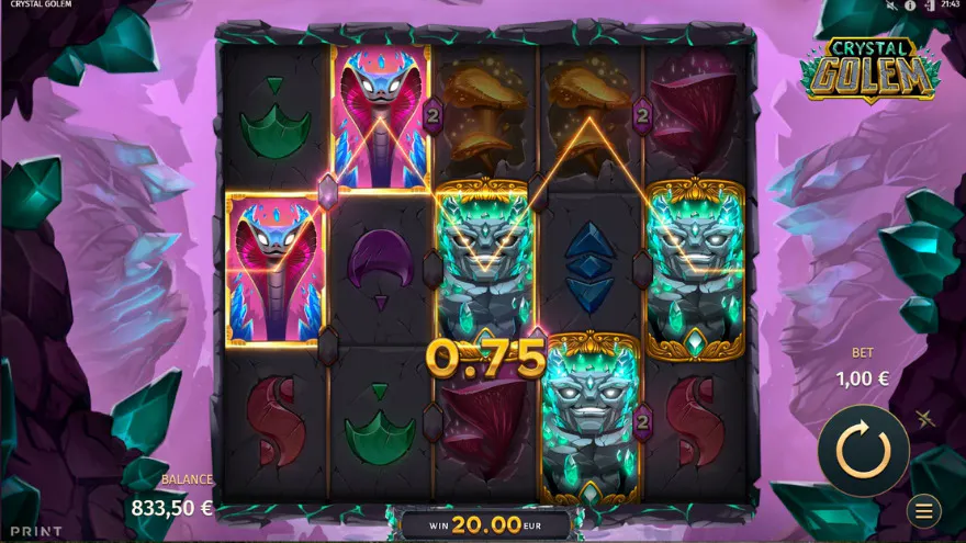Crystal Golem slot has an impressive math model ensures players win handsome payouts during the gaming session. On each spin, whether playing in the base mode or the free spins round, players can win 20,758x the bet.