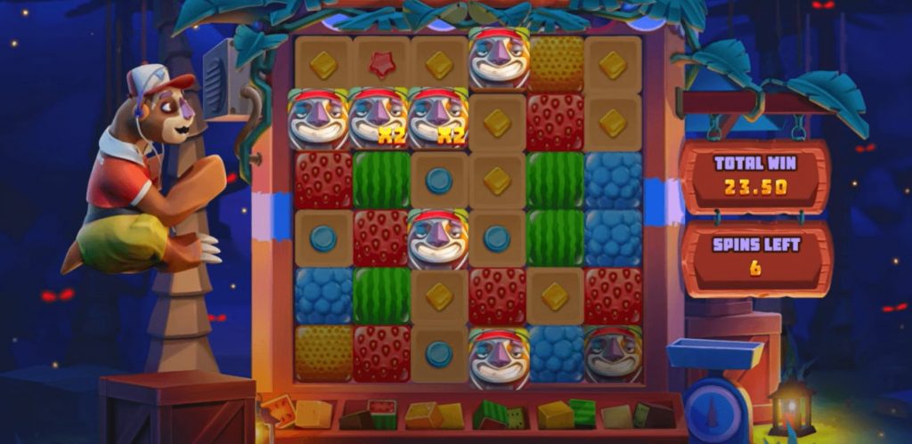 The Sloth Tumble slot released in July 2023 introduces Chip, a fun-loving retailer. Chip is into selling all sorts of juicy and succulent fruits and candy. Chip’s shop is located in an animated exotic resort; hence, when players launch the game, they find themselves in this stunning region. The beauty of the exotic resort, accentuated by the bright and colorful fruits and candy on the reels, makes the Sloth Tumble a visually pleasing game to play.s